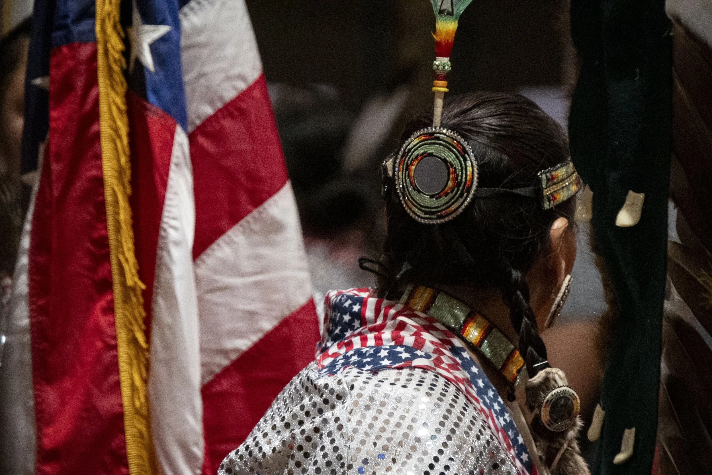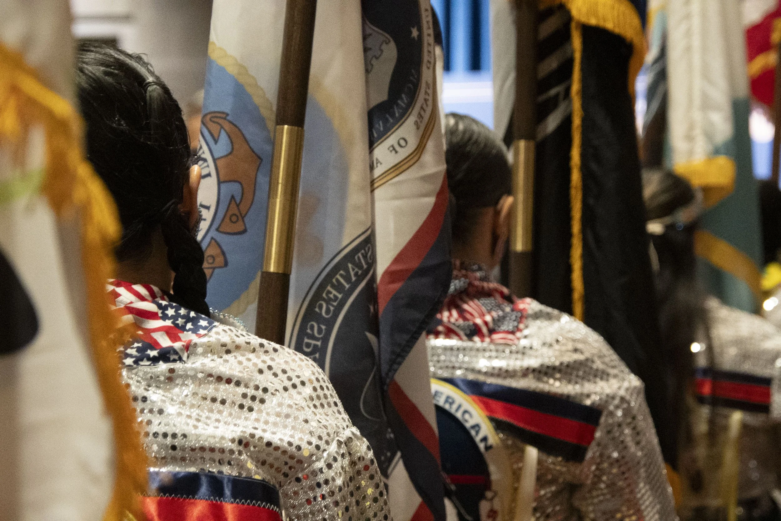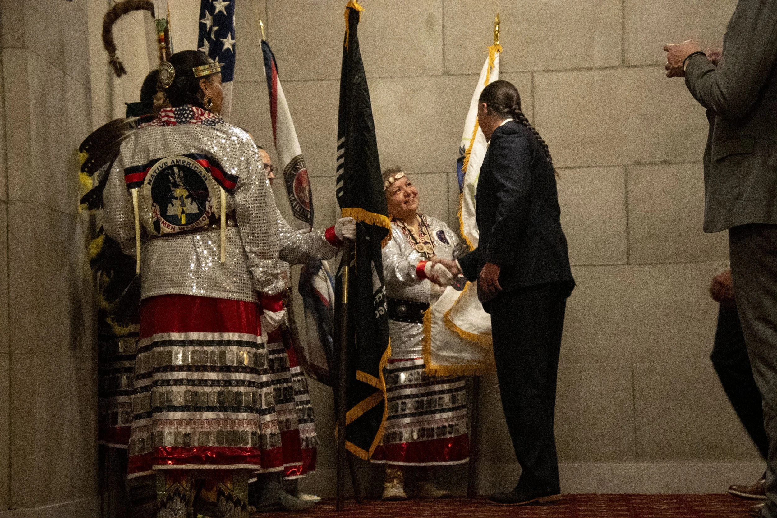 U.S. Army veteran Mitchelene BigMan of the Crow Tribe led the Native American Women Warriors color guard procession for the opening ceremonies of the 2023 Tribal Nations Summit. BigMan's NAWW which she founded, was the first all-native American Women's Color Guard according to the Smithsonian.