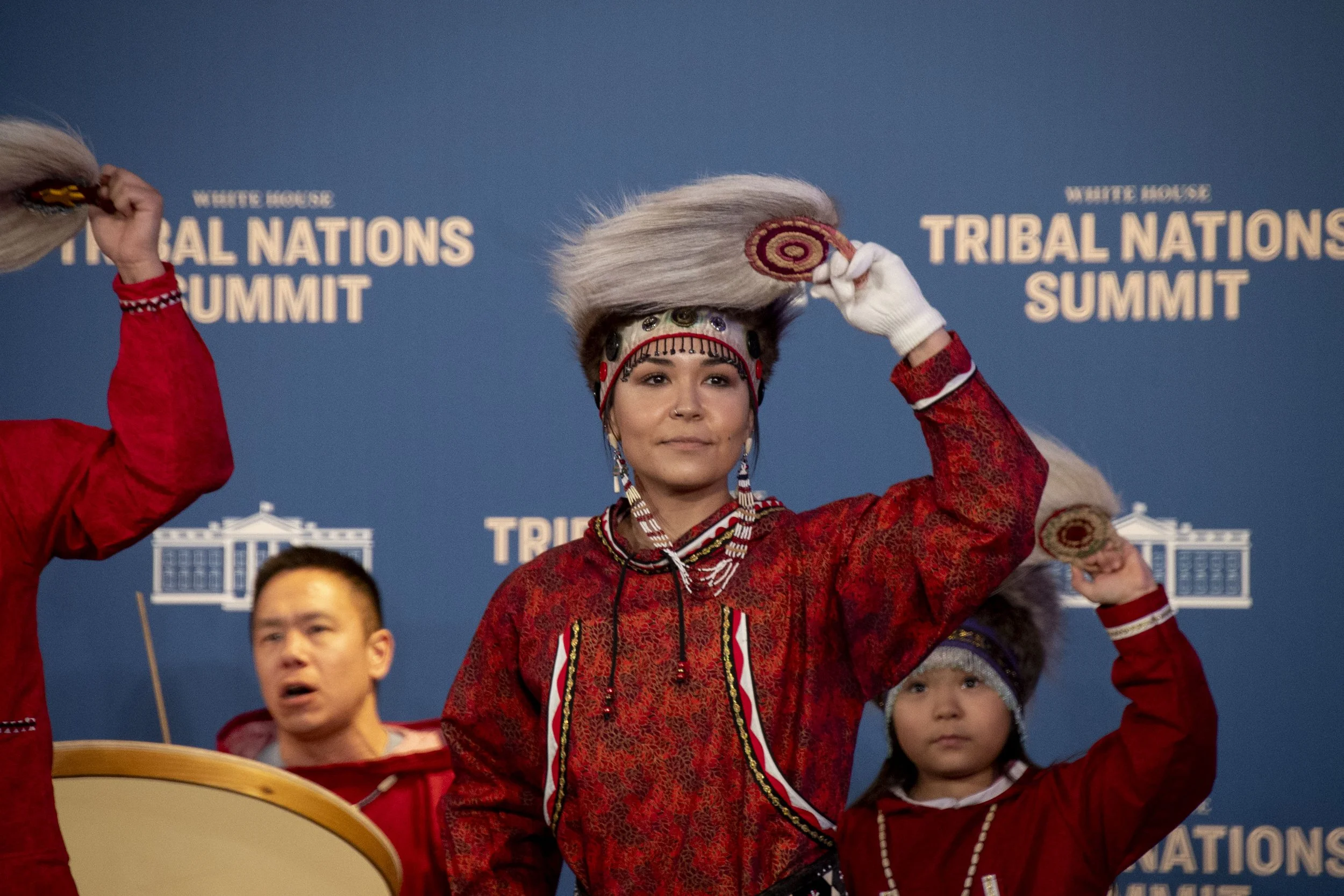 After lunch, the Chevak Dance Group of the Chu’pik Tribe in Alaska performed a series of songs for the White House Tribal Nations Summit attendees. The dance group is made up of multiple generations and varying ages.